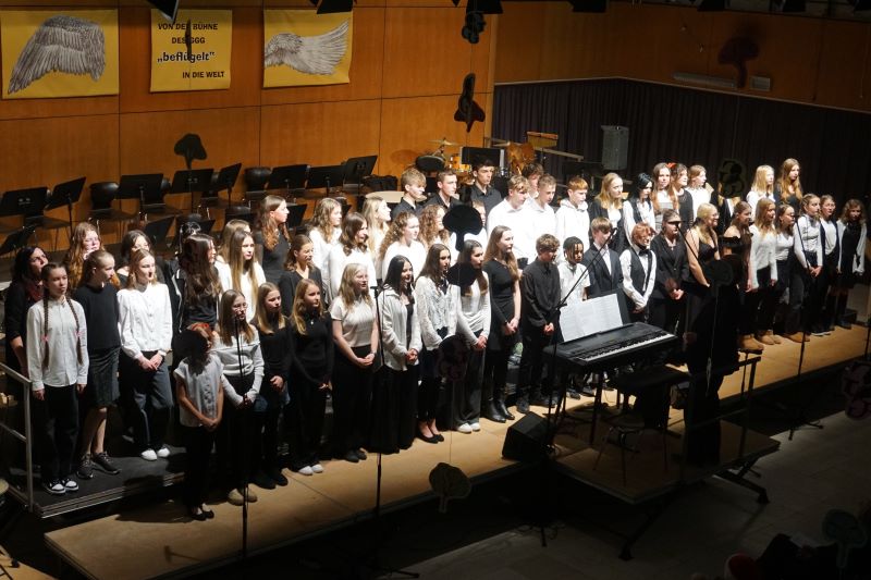 Neben den Schülerinnen und Schülern aus der Jahrgangsstufe 13, die Jürgen Weisser mit einem Song würdigten, wurden auch Alexander Haldzinski, Jonas Dietz, Jonathan Maier und Fabian Werner als langjährige Mitglieder in Orchester bzw. Chor anlässlich ihres letzten Konzertes vor dem Abitur mit Dankesworten verabschiedet.