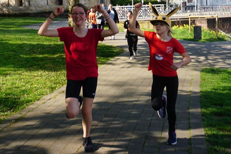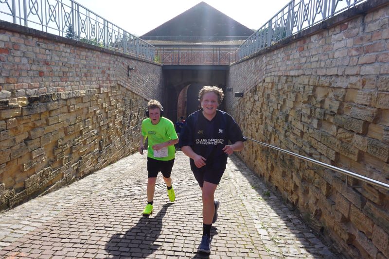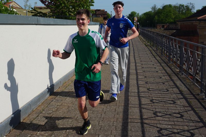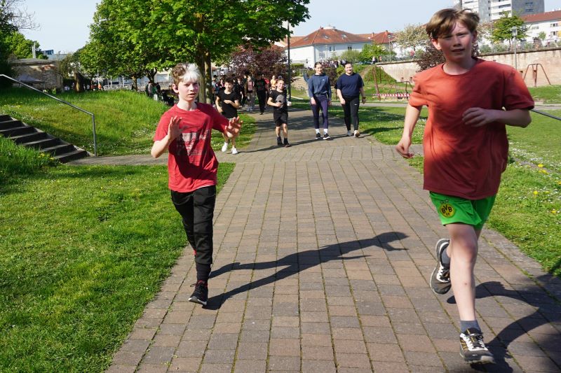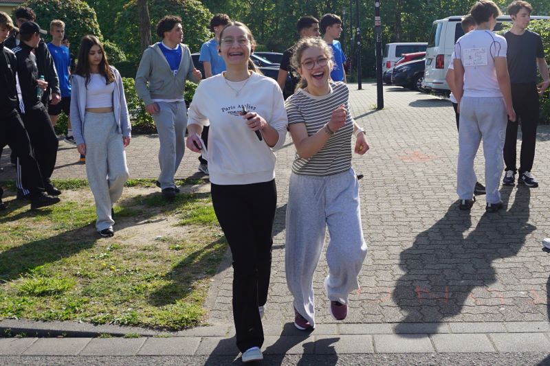 Das Ziel, soziales Engagement und sportliche Aktivität miteinander zu verbinden und das Zusammengehörigkeitsgefühl der Schulgemeinschaft zu stärken, wurde erreicht: Voller Motivation und Tatendrang starteten die Schülerinnen und Schüler der Unter-, Mittel- und Oberstufe vom Pausenhof aus auf die zwei Kilometer lange Strecke durch den Park „Fronte Lamotte“, am Busbahnhof vorbei, um die Stadthalle herum, an der Eduard-Orth-Grundschule entlang und schließlich wieder zurück zum Haupteingang des Gymnasiums.