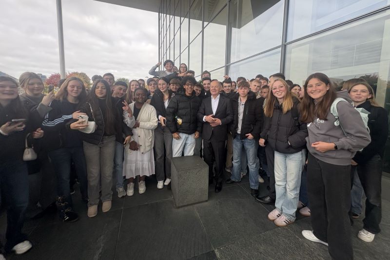 „Ooooolaf!“, schallt es aus aller Munde! 65 Schülerinnen und Schülern blicken gebannt in Richtung der schwarzen Limousine, in die gerade ein Mann mit charakteristischer Frisur und seiner allseits bekannten Aktentasche einsteigen möchte. Letztere lässt er im Auto, doch er selbst steigt nochmals aus! Schnell nähert er sich den Klassen 10a, 10b und 10d, grinsend, so wie man ihn kennt. Er weiß, was alles wollen: ein Foto mit dem ehemaligen Bundeskanzler! Geistesgegenwärtig drückt jemand auf den Auslöser. Olaf Scholz blickt lächelnd in die Runde und schon ist der Moment vor dem zum Bundestag gehörenden Paul-Löbe-Haus vorbei. Er steigt ins Auto und schon ist er weg! Ist das wirklich passiert?