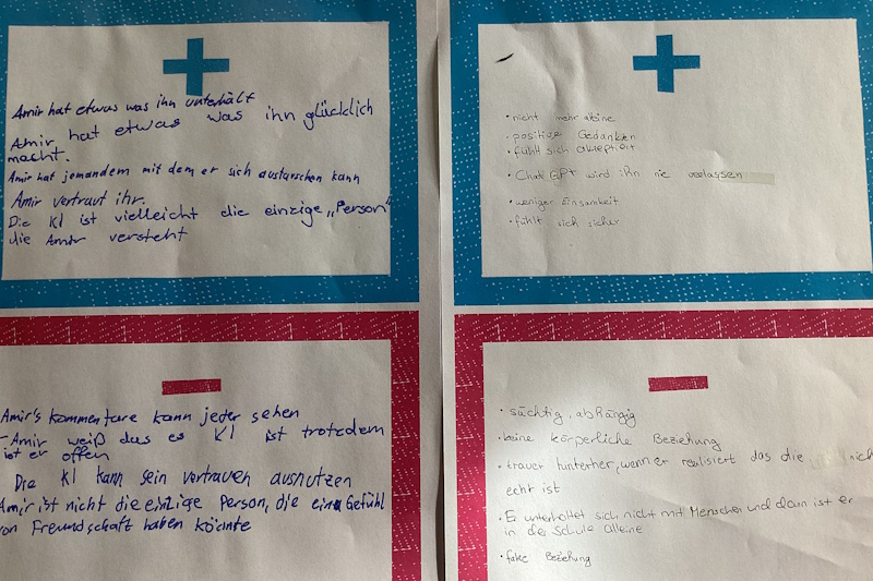 Dabei gilt besonders: Achtet auf eure Privatsphäre und Datenschutz. KI darf keinen negativen Einfluss auf eure mentale Gesundheit haben oder euch zu problematischem Verhalten verleiten. Die KI darf nicht in Konkurrenz zu echten Menschen, Freunden oder Familie stehen. Begebt euch nicht in emotionale Abhängigkeit – besonders bei Plattformen wie Character.AI ist Vorsicht geboten.