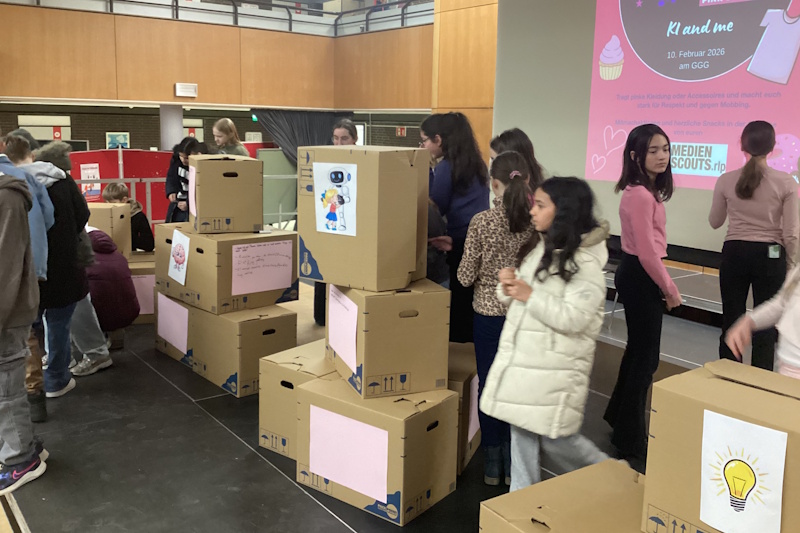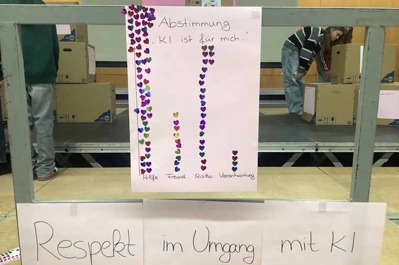Nach der Mitmachaktion für alle in der Pause nahmen unsere Medienscouts mit 53.000 anderen SchülerInnen an der digitalen Schulstunde „KI & me. In künstlicher Beziehung.“ von klicksafe teil. Sie stimmten bei Umfragen über Menti mit ab, wobei deutlich wurde, dass ein Großteil regelmäßig mit einem Chatbot über ChatGPT, Gemini, Perplexity, Grok etc. schreibt, um Hilfe bei Hausaufgaben zu bekommen, zu lernen und sich zu informieren. Außerdem beschäftigten sie sich damit, wie beim Chatten emotionale Bindungen zu Chatbots entstehen und was Gefahren dabei sind. Wir sollten keine Angst vor KI haben. Sie wird ab jetzt wahrscheinlich immer Teil unseres Lebens sein. Entscheidend ist aber, dass wir einen sinnvollen und reflektierten Umgang mit ihr erlernen.