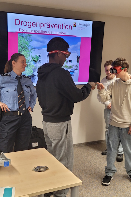 Zu diesem Teil gehörte auch ein Vortrag von Frau Block über die verschiedenen Arten von Drogen. Deutlich machte sie besonders die Gefahr von sowohl legalen als auch illegalen Drogen im Straßenverkehr. Aber speziell der Einfluss von Alkohol auf unsere Wahrnehmung wurde den Schülerinnen und Schülern durch Übungen mit sogenannten Promillebrillen ersichtlich. Das Fazit der Schülerinnen und Schüler bestand in der Erkenntnis, dass man einem Rausch längerfristig ausgesetzt ist und nicht einfach die Brille abziehen kann.