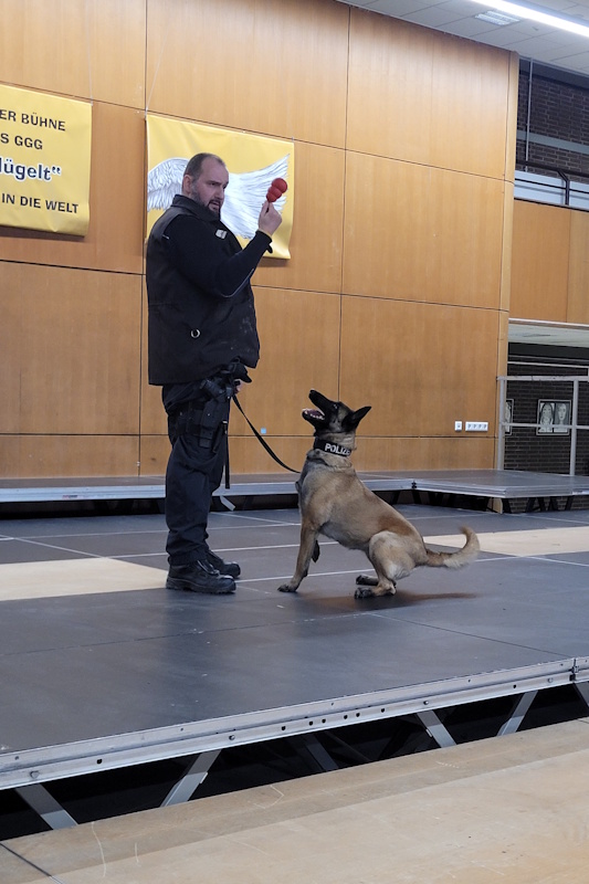 Den Abschluss der Präventionswoche bildete eine Vorführung der Fähigkeiten eines Drogenspürhundes. Still und aufmerksam hörten die Schülerinnen und Schüler den Ausführungen des Polizeihundeführers zu, der von der Auswahl, dem Training und dem Leben eines Polizeispürhundes berichtete. Natürlich wurden auch einige Fähigkeiten des Hundes auf der Aulabühne präsentiert. Davor und danach durften die Schülerinnen und Schüler Fragen zur Ausbildung und dem Umgang mit dem Hund stellen.