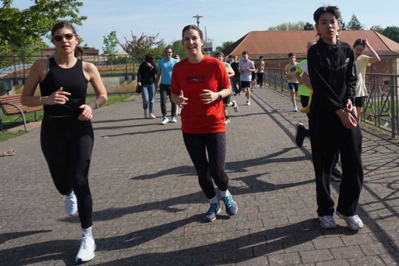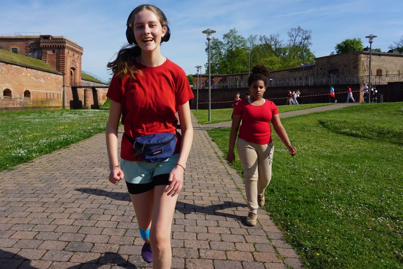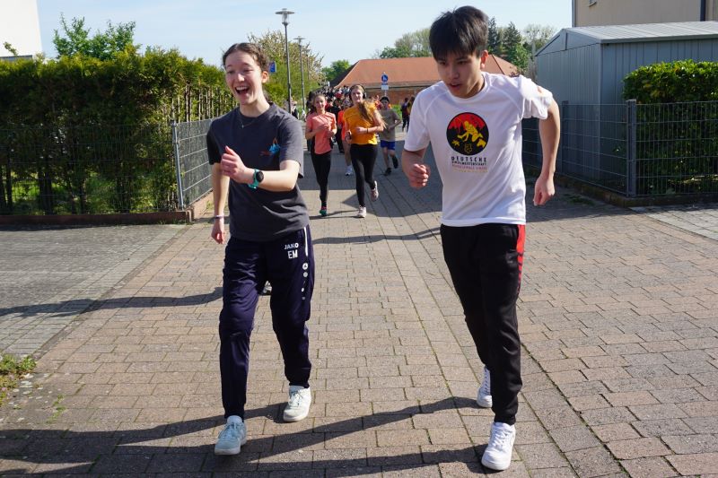 Das Ziel, soziales Engagement und sportliche Aktivität miteinander zu verbinden und das Zusammengehörigkeitsgefühl der Schulgemeinschaft zu stärken, wurde erreicht: Voller Motivation und Tatendrang starteten die Schülerinnen und Schüler der Unter-, Mittel- und Oberstufe vom Pausenhof aus auf die zwei Kilometer lange Strecke durch den Park „Fronte Lamotte“, am Busbahnhof vorbei, um die Stadthalle herum, an der Eduard-Orth-Grundschule entlang und schließlich wieder zurück zum Haupteingang des Gymnasiums.