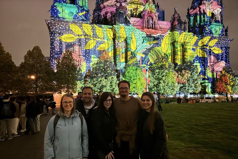 Darüber hinaus standen je nach Klasse die Siegessäule, der Alexanderplatz, das Brandenburger Tor, das Schloss Bellevue, das Holocaustmahnmal, die Topographie des Terrors, der Potsdamer Platz, der Checkpoint Charlie und vieles mehr auf dem Programm. Besonders eindrucksvoll wirkten einige dieser Gebäude kunstvoll beleuchtet während des „Festival of Lights“, das alle Klassen besuchten.